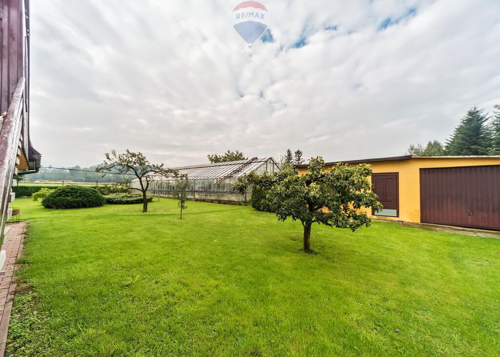 jest dom, budynek gospodarczy z garażem, obszerna szklarnia oraz